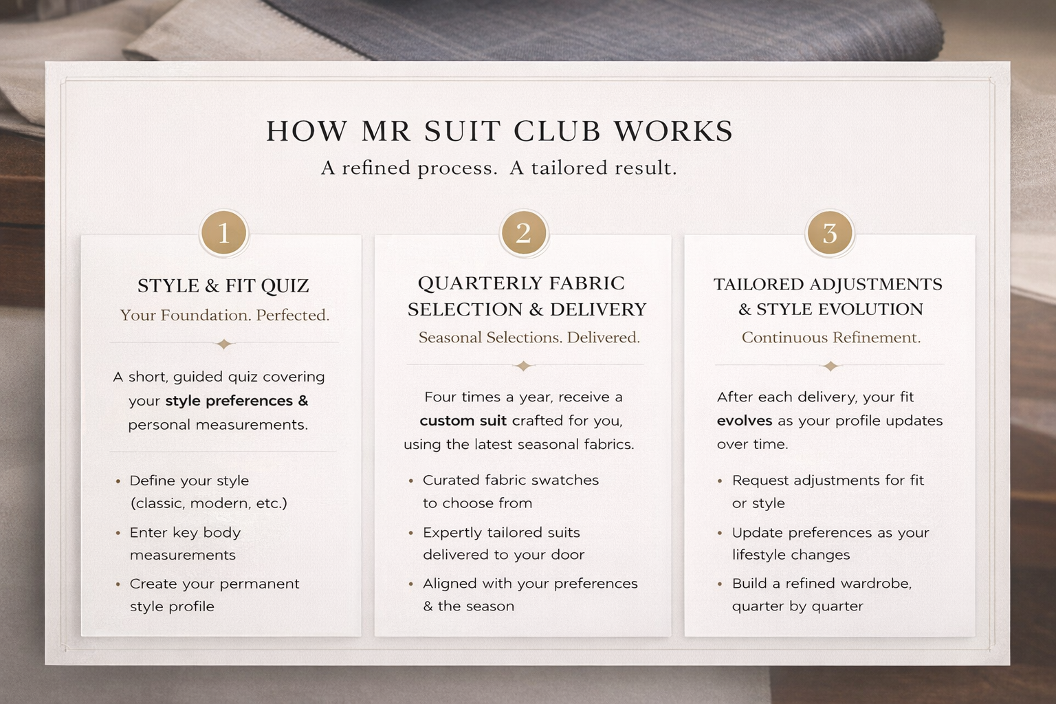 Quarterly, custom-curated suits — delivered without shopping, fittings, or wasted effort.